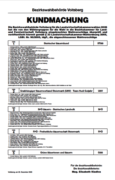 Amtstafel - Kundmachungen allgemeine Verwaltung Bau- und Raumordnung Finanzen allgemeine Verwaltung Landwirtschaftswahl 2026 - Bezirkswahlbehörde Voitsberg Weiterlesen Kundmachung - Landwirtschaftskammerwahl 2026 Auflegung des Wählerverzeichnisses & Berichtigungsverfahren Weiterlesen Kundmachung - Landwirtschaftskammerwahl 2026 Verfügungen der Gemeindewahlbehörde vor der Wahl (Wahllokal, Wahlzeit, Verbotszone) Weiterlesen Kundmachung - Landwirtschaftskammerwahl 2026 Mitglieder der Wahlbehörde und Vertrauenspersonen Weiterlesen Verständigung Zurücklegung - Jagdaufseher Krammer Weiterlesen Bau- und Raumordnung Kundmachung wasserrechtliche Überprüfung Weiterlesen Kundmachung Bauverhandlung Weiterlesen Finanzen Keine Nachrichten verfügbar.